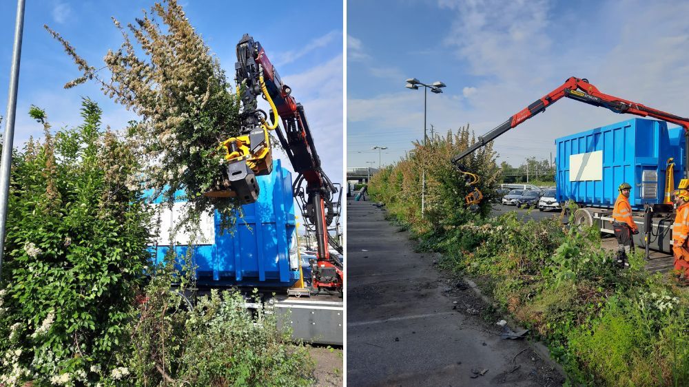 - Le principe est de maintenir les arbustes avec le grappin GMT 350 monté sur la grue et tronçonné au plus près du sol.