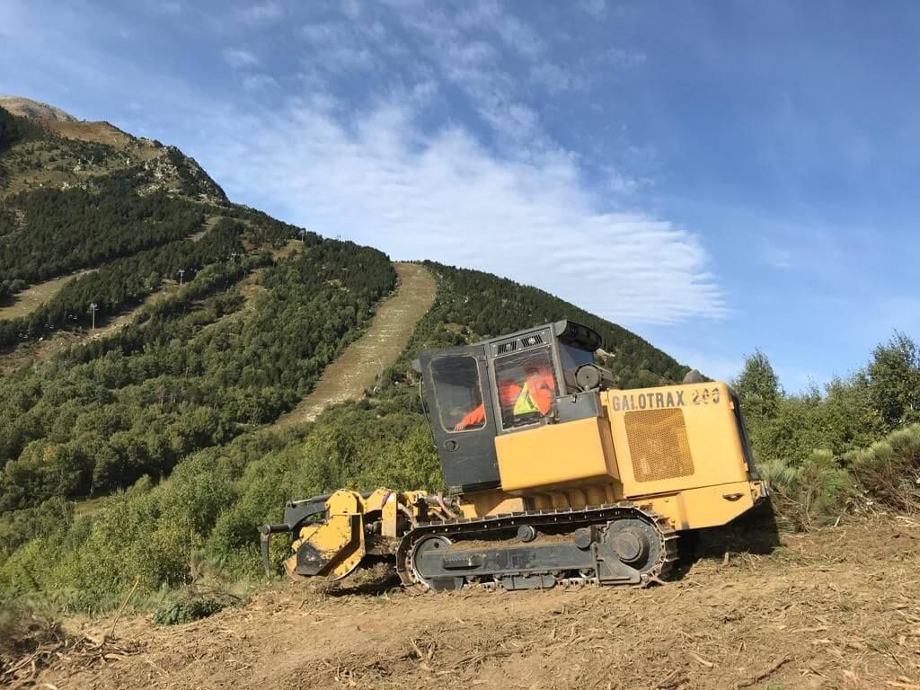 Le débroussaillage a été réalisé mécaniquement à l’aide d’un chenillard forestier avec broyeur frontal (Galotrax) emmené sur chantier par un porte-char, et manuellement pour les zones trop pentues, inaccessibles aux engins.